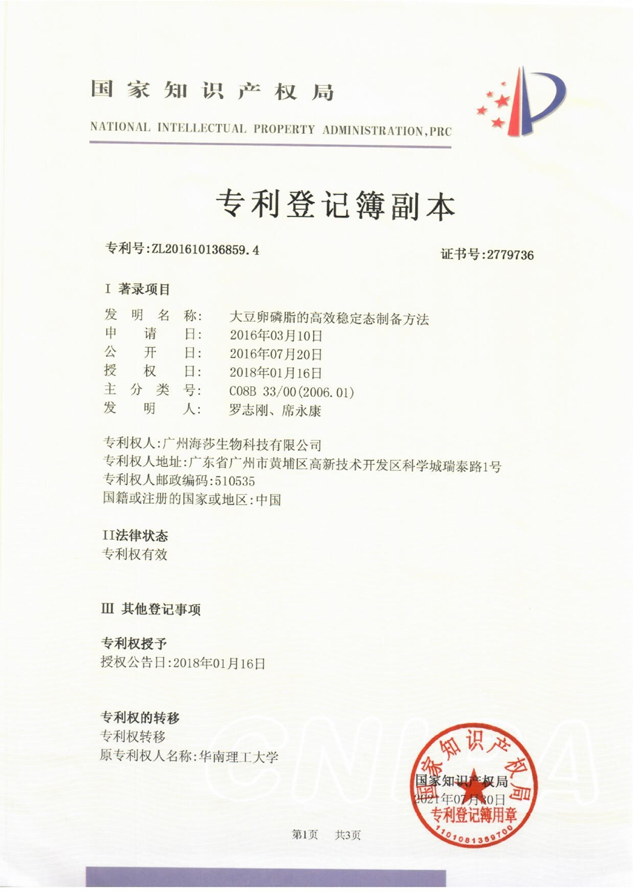廣州海莎生物科技有限公司獲磷脂生產新專利,為開發高質量磷脂 產品提供了保障。
